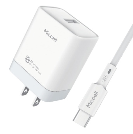 es un cargador de pared de la marca Miccell con capacidad de carga rápida de 22.5W. Modelo: Miccell 22.5W Fast chasger Contenido: Incluye el cubo de carga y